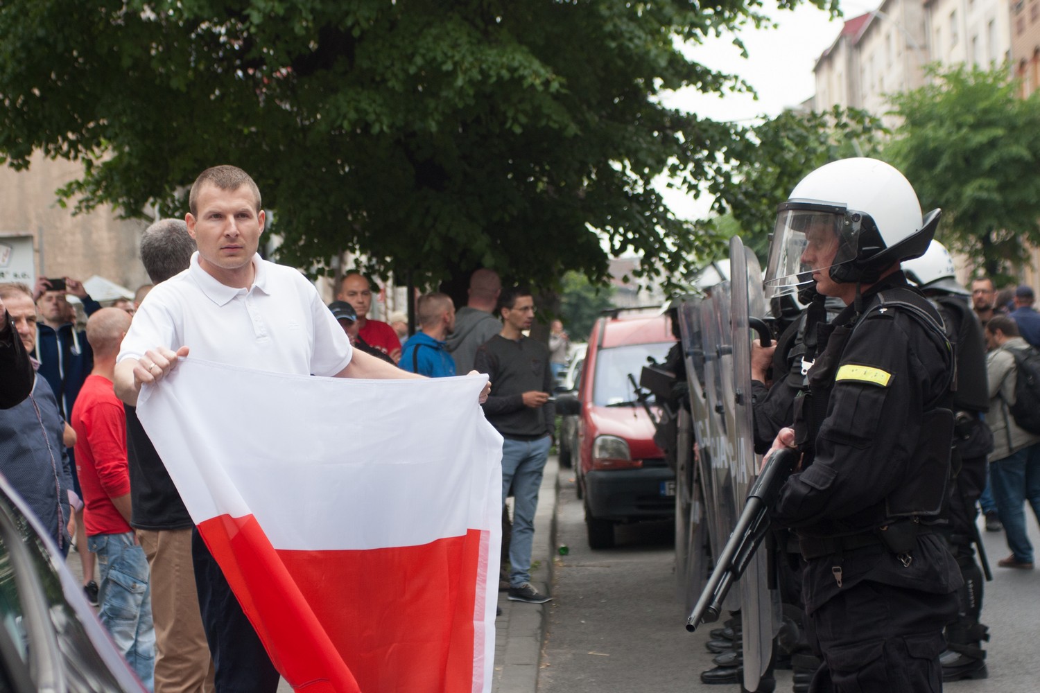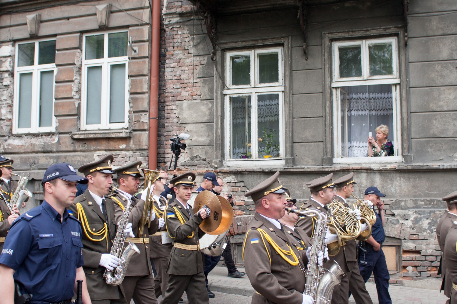 Процесія йшла під співи пісень Січових стрільців. Місцеві з вікон квартир та обабіч вулиць із цікавістю спостерігали за незвичною для 70-тисячного провінційного містечка атракцією. Поліція нікого з них не впускала в колону, хоча кілька сп’янілих осіб пробували увійти. Супроводжували ходу півтора десятка підлітків десь по 15 років та з десяток старших. Частина у футболках із гербом та в барвах прапору Польщі. Коли колона проходила центром міста, то в одній із квартир на повну гучність із динаміків увімкнули польський гімн, аби перебити українські січові пісні. У колоні послухали гімн і продовжили співати.